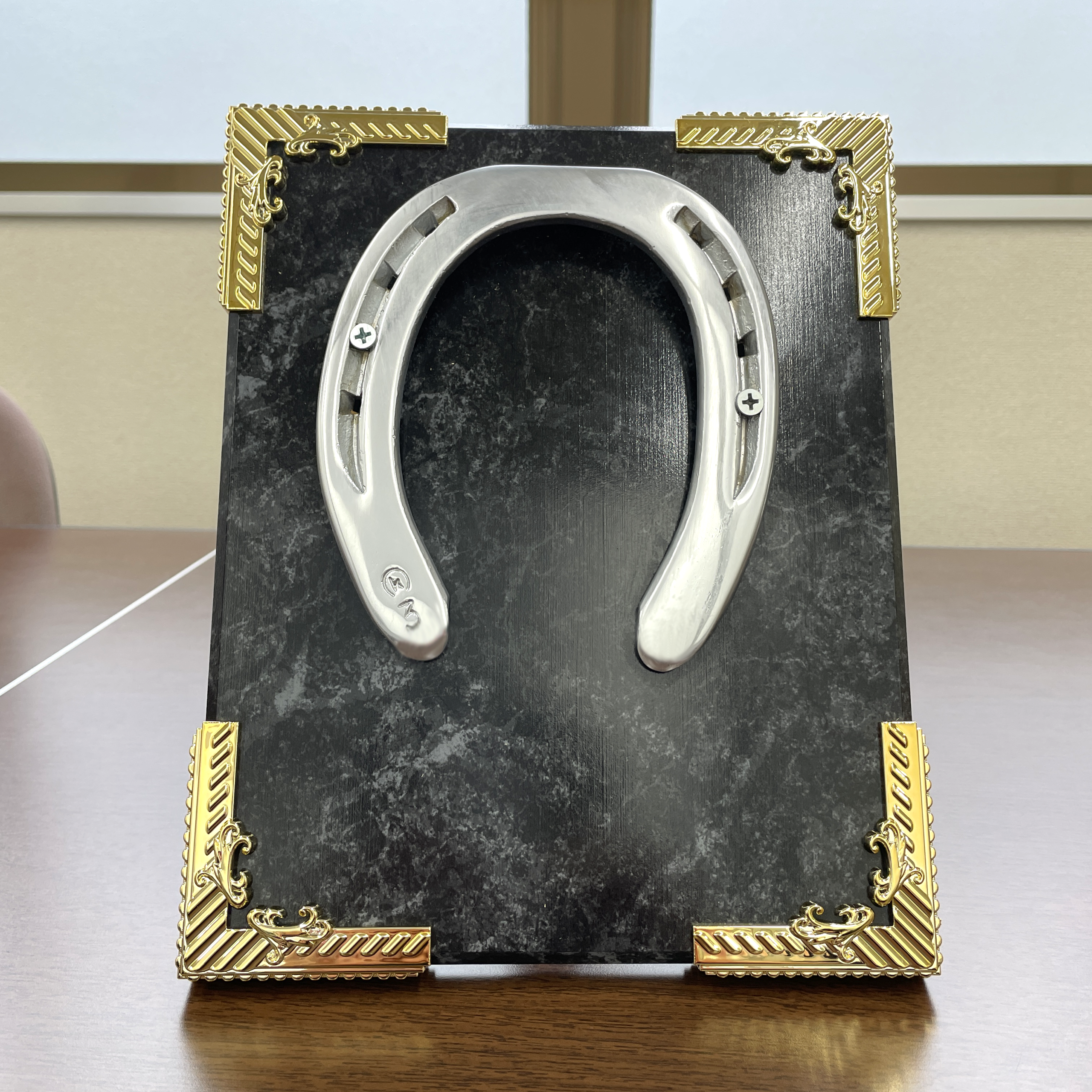 お預かりした蹄鉄を、既成の楯板に取り付けました。